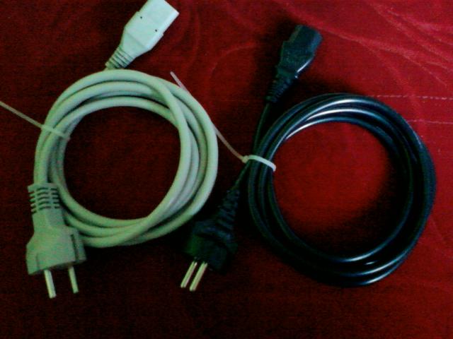 Maitinimo kabeliai kompiuteriu. Yra juodos ir pilkos spalvu.