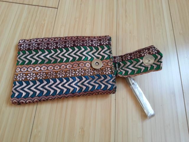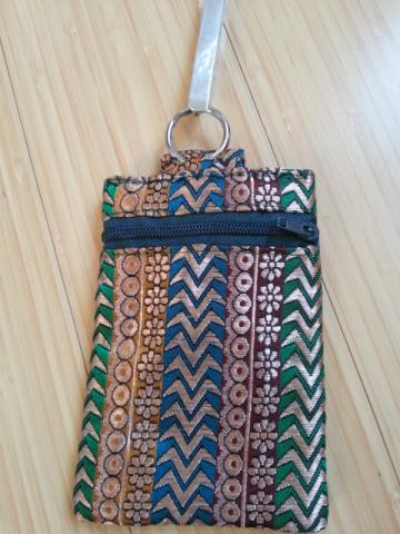 Atvežtas iš Indijos. Nedideliam telefonui arba raktams. Naujas, nenaudotas. Medžiagėlė išausta auksu žibančiais siūlais. Metalinė sagtelė pasikabinimui ant diržo. Iš viršaus - sagtelė su magneto spaustuku. Iš nugarinės pusės - 'slapta' kišenėlė su užtrauktuku. Dydis: 12,5 cm x 8-8,5 cm (h)