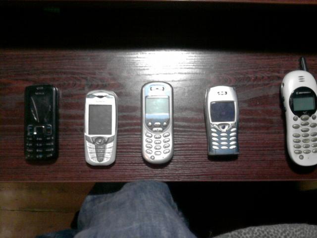 Nokia 3110c - dauztas dangtelis, veikiantis. Siemens CX65 - neisijungia, greiciausiai akumas mires(ilgai nenaudotas),tokia pat problema MOTOROLA T192, SE spalvotas su plemu ant ekrano ir didelis MOTOROLA! :D