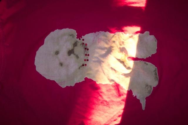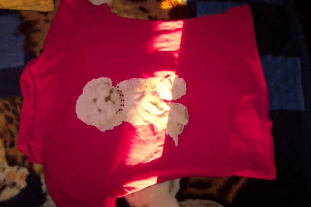 Apynauje,ryski maikute,nugaroje didelis baltas pudeliukas,o priekija desneje puseje mazytis :)