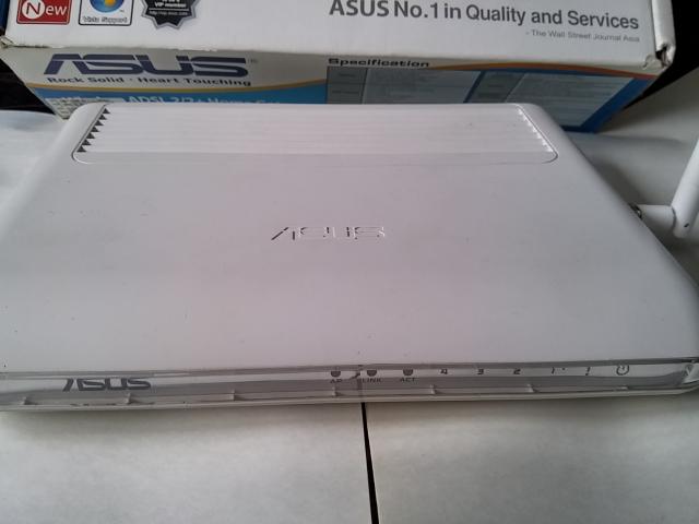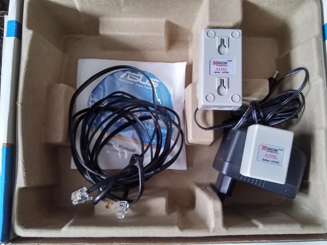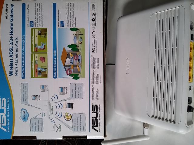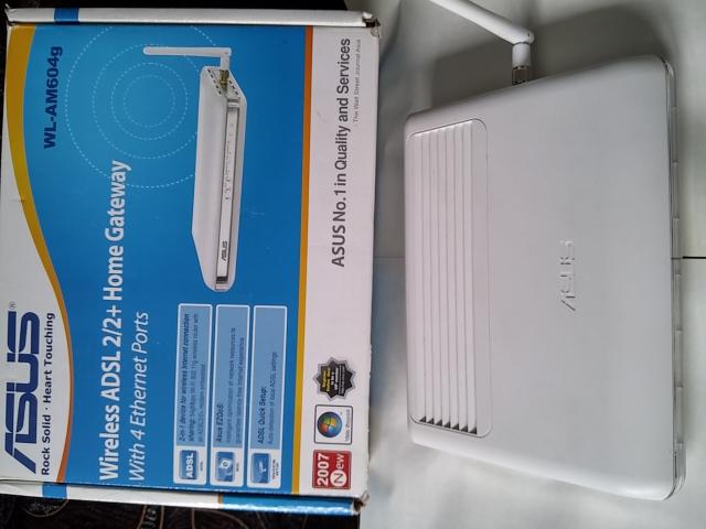 Galima sakyti naujas bevielis Asus ADSL routeris, normaliai veikiantis, trumpai naudotas, su dėžute. Komplekte yra telefoninis laidas, telefono linijos skirstytuvas, ADSL filtras, naudotojo CD, maitinimo blokas. Aprašymą rasite čia: https://www.asus.com/us/Networking/WLAM604g/ ( anglų k. ) https://www.asus.com/ru/Networking/WLAM604g/ (rusų k.)