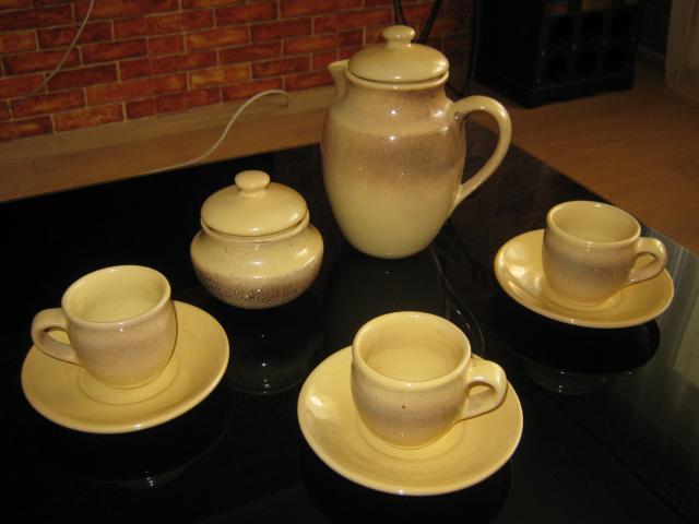 Smelio spalvos su rudos juostos pereimu. Arbatinukas 20 cm aukscio, cukrine 10 cm aukscio, puodelio skersmuo 6,5 cm, o jo lekstutes 13 cm. Rinkini sudaro arbatinukas, cukrine ir 3 puodeliai su lekstute. Labai mielas serviziukas, nenaudotas.