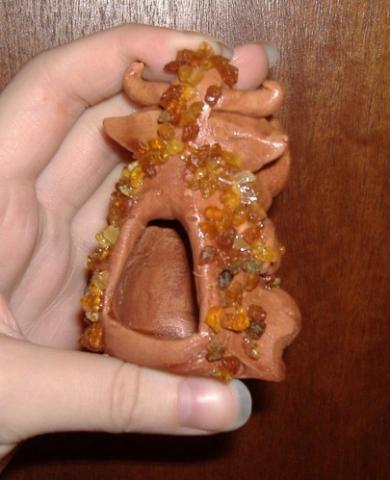 Miela karvytė su gintaro gabaliukais/dekoracija. Nugaroje yra vieta mažytei žvakutei. Nenaudota, įsigyta Pilies gatvėje.