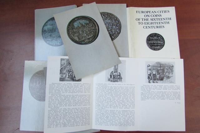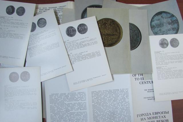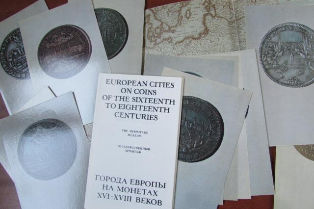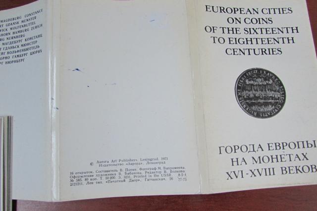 European cities on coins of the sixteenth to eighteenth centuries. (1973, Russia) Europos miestai XVI - XVIII amžių monetose. 16 atvirukų. Miestai monetose - Venecija, Magdeburg, Constance, Thorn, Erfurt, Gdansk, Munster, Riga, Brunswick, Wolfenbuttel, Copenhagen, Leghorn, Hamburg, Zurich, Freiberg, Nurnberg. 16 atvirukų, jie puikios būklės. Priedas - lankstinukas su aprašu. Kiek pasidevėjęs atvirukų aplankas, likusi žymė nuo kainos lipduko, yra dėmelė (matosi foto būkė).