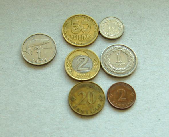 Latvijos proginis latas (1992m.), 20 santimų(1992m.), 2 santimai (2000m); Ukrainos 50 kopijok (1992m.); Lenkijos 2 zlotai (1995m.), 1 zlotas (1991m.),10 groszy (2003m.)