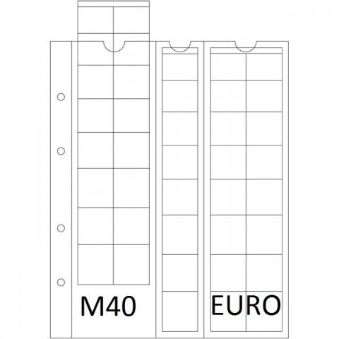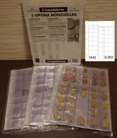 • B5 formatas • Ištraukiama juostelė iš viršaus • Langeliai pagal Euro monetų SETAMS • Lape telpa 5 komplektai 8 Euro monetų (setų) • Optima M grupė • Albume 5 Optima M40 lapai