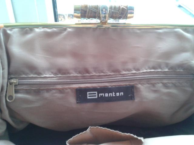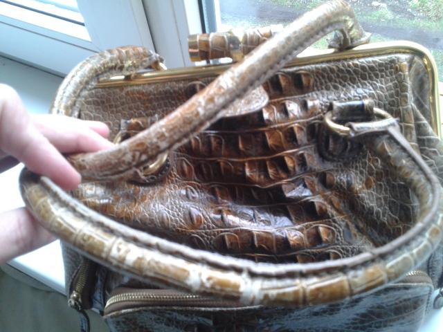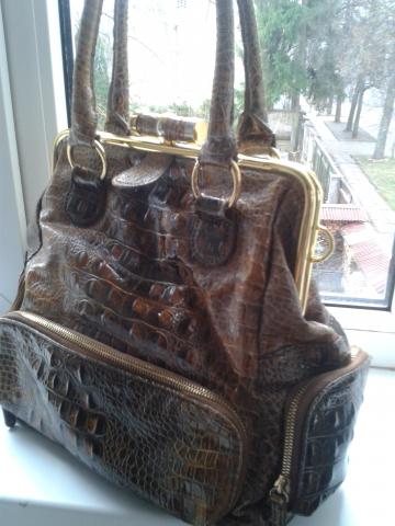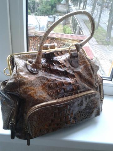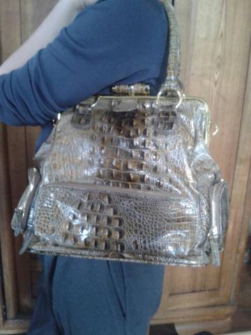 Puiki-krokodilo imitacijos, lakuota ir auksinta rankine, nesioti per rankenas, yra trys isorines kisenes, videje viena uzsegama ir viena telefonui isideti. Yra itrukimu ant rankenu bet vaizdo nebjauroja,labai stilinga.
