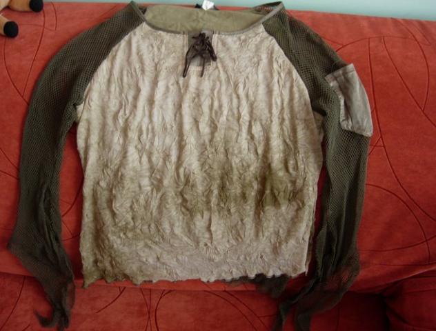 Labai originali palaidinė. Dvisluoksnė: apačioje kaip šilkinis pamušalas, o viršuje glamžyta medžiaga. Rankovės tinklinės, jos susiriša i bantukus. Spalva truputį šiltesnė nei foto - žalsva.