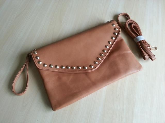 Stačiakampio formos; Viduje yra pamušalas; Yra užtrauktukas; Viduje yra užtraukiama kišenėlė ir dvi mažos; Išorinė kišinė su užgtrauktuku; Su dviem dirželiais: trumpas - riešo, ilgas dėvėjimui per petį; Matmenys: ilgis - 33,5 cm, aukštis – 22,5 cm; Spalva: karamelinė( šviesiai ruda). Sudėtis - Medžiaga – dirbtinė oda.