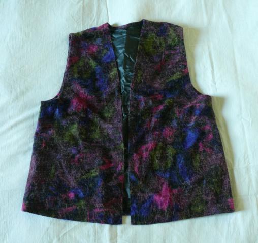 Moteriška švelnios medžiagos rankų darbo liemenė su pamušalu. Be užsegimo. Tiktų 46 - 48 dydžiui. Liemenės ilgis nuo peties siūlės ties apykakle iki apačios - 67 cm, Plotis ties pažąstimis - 56 cm x 2. Be defektų