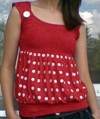 raudona su baltais rutuliukais,nuo krutinės platėjanti ir po pilvu vėl sutraukta.