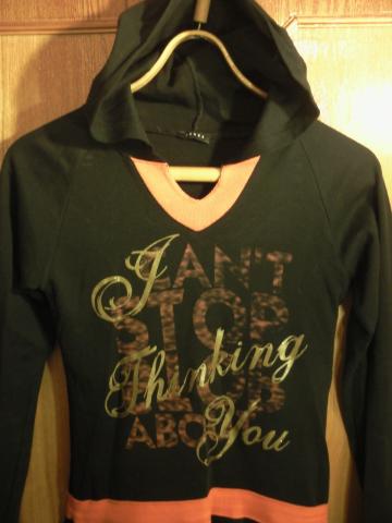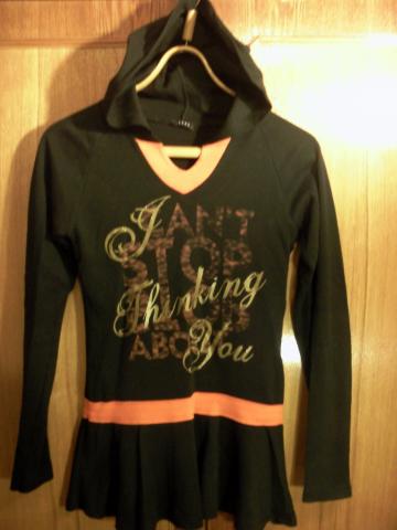 Juodos spalvos moteriska palaidine su kapisonu ir su etikete KANER ir uzrasais is priekio.