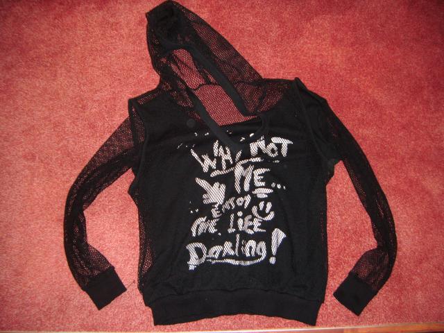 Juodos spalvos. dviejų sluoksnių. apatinis sluoksnis - maikutė trumpom rankovėm, viršutinis - tinklinė maikutė ilgom rankovėm su kapišonu. su užrašu. 18 LT Mainai nedomina:)