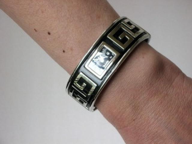 Galima nešioti kaip laikrodį, arba tiesiog, kaip apyrankę, Sunkus (metalinis- ne plastmaskė). dekoruotas graikiškais ornamentais.Veikia, tik reikia pakeisti bateriją.