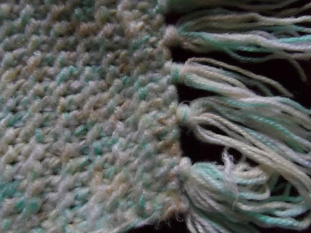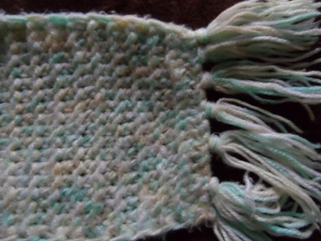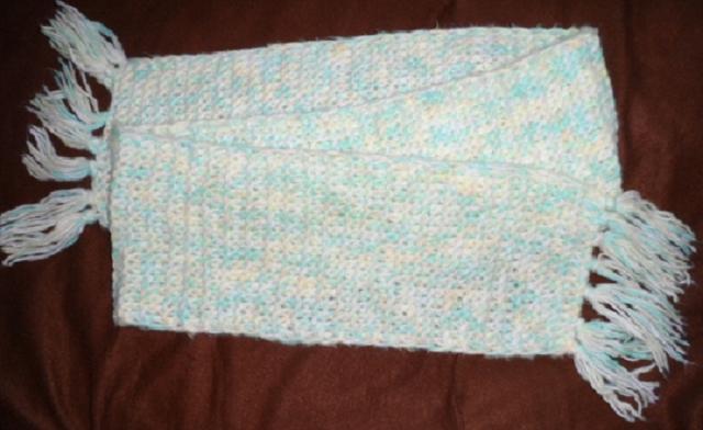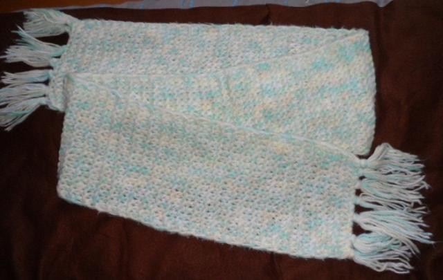 Rankų darbo šalikas. Ilgis – 177 cm (iki 200 cm su papuošimais), plotis – 21 cm. Spalvos: balta, žalsva, gelsva