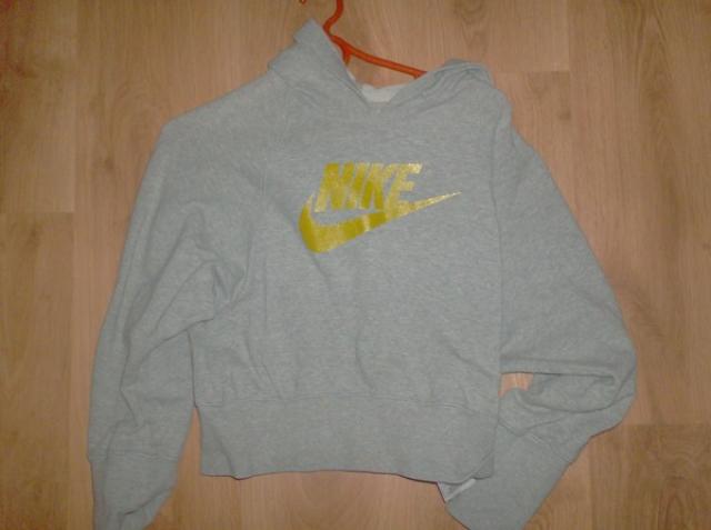 Moteriškas Nike džemperis, su kapišonu.Pilkos spalvos, trumpas.Dydį rašo S.Užrašas nike - auksinės spalvos.80% - medvilnė, 20% - poliesteris.