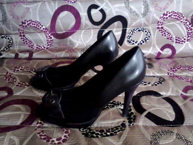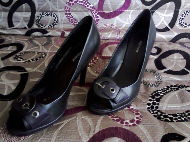 Tik kelis kartus nešioti, moteriški aukštakulniai. Kulnas maždaug 10cm aukščio. Patogūs, juodi, priekis ir kulnas tamsiai violetiniai. Bato priekis praviras. Yra vienas nežymus defektas: bato priekis šiek teik nugrandytas, bet nešiojant-nesimato:)