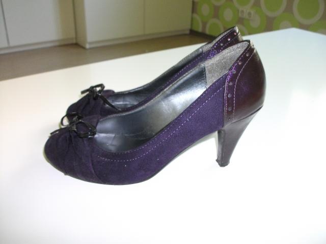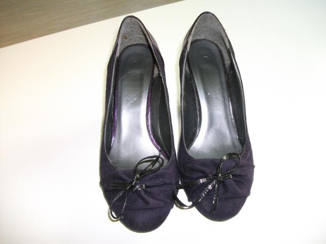 Padėvėti bateliai, tamsiai violetinės spalvos, šonai medžiaga, priekis ir galas - oda, geros būklės.