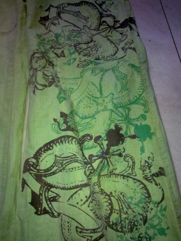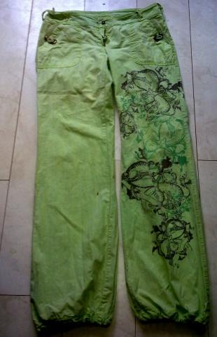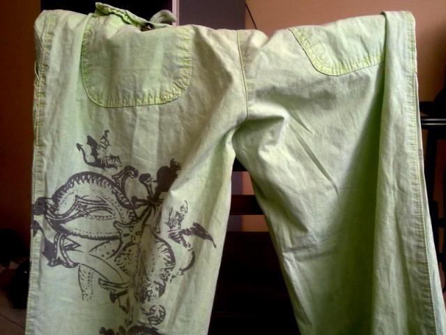 Kelnytės labai lengvos, vasarinės, šviesios žalsvos spalvytės. Mano ūgis 167, todėl tinka tokio ūgio merginoms.Kelnių galai suraukti, raikšteliu. Nuotraukoje šiek tiek nubrizgęs galas.