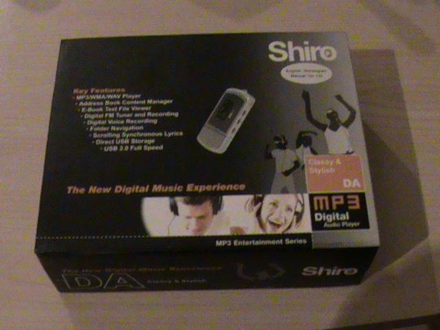 Shiro MP3 grotuvas, gera kokybe ir garsas,nepaisant to, kad jam jau 5metai (buvo isigytas topo centre) veikia be priekaistu. Kraunasi per USB (ne ant elementu), yra instrukcija, diskelis ir dezute. Be ausinuku.