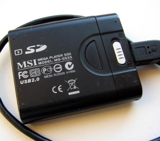 MSI Mega Player 533 MP3 grotuvas. 256 MB, bet dedasi SD kortelė. Yra radijas, diktofonas, ekvalaizeris. Veikia puikiai. Grojimo kokybė nėra labai gera, bet neišranki ausis gali klausyti. Pridedu USB laidą. Ausinių nėra. Maitinamas viena AAA baterija.