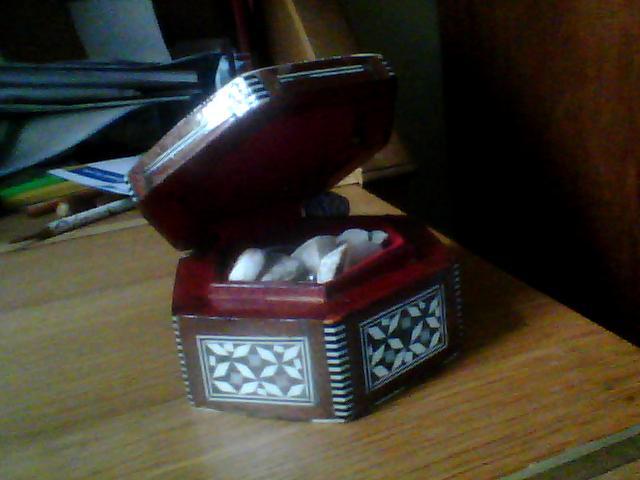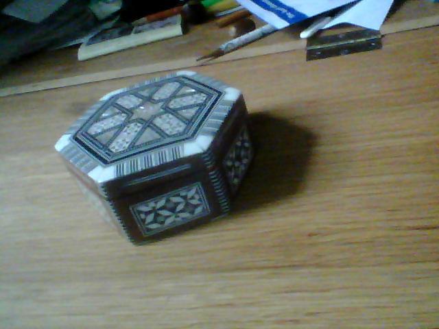 Medinė su aplikacijomis, šešiakampė, nedidelė - papuošalams ar pan. Vidus ryškiai raudonas. Jokių defektų. Parsivežta iš Sirijos.