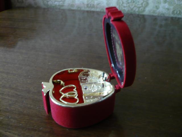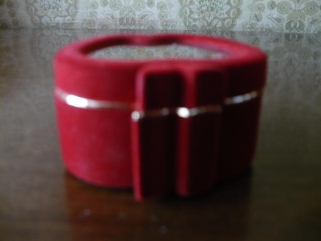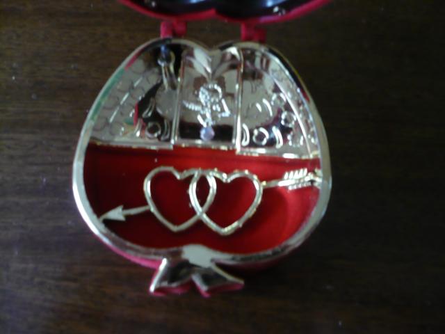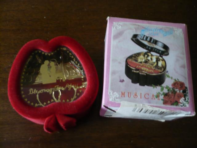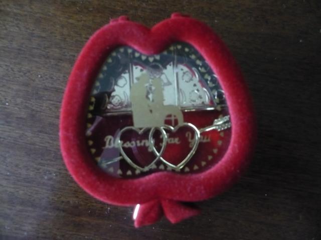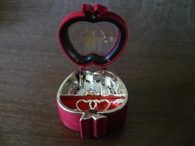 Muzikinė dėžutė . Jau nebegroja, bet puikiai tinkanti žiedams laikyti. būklė kaip naujos. Ant stiklinio langelio užrašas "Blessing For You". Dėžutė obuolio formos. Raudonas paviršius barchatinis (aksominis), Blizgios detalės —aukso spalvos. Ant stikliuko— porelės kontūrai, viduje—amūras-angeliukas. Aukštis 4 cm, plotis 7 cm