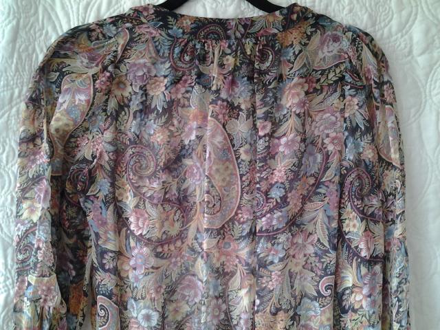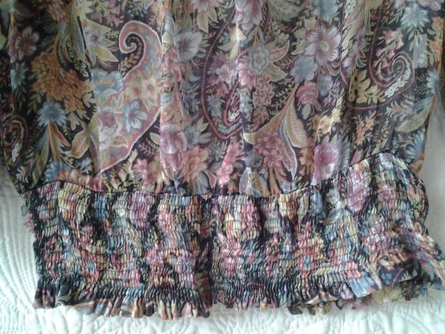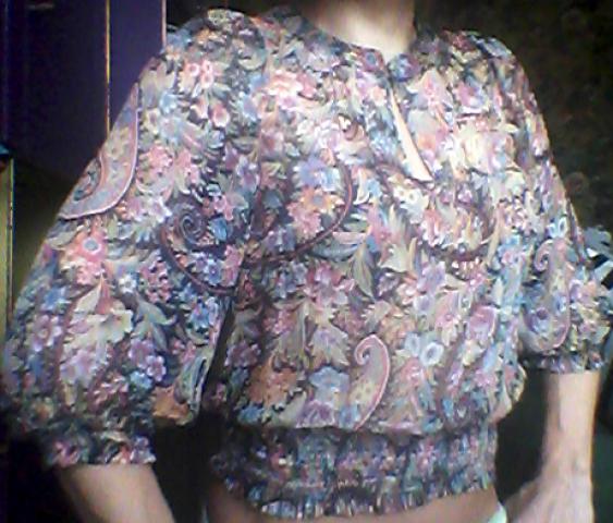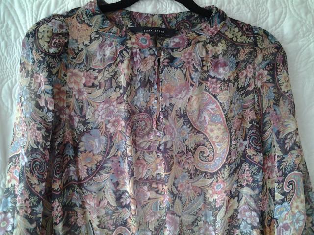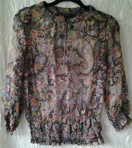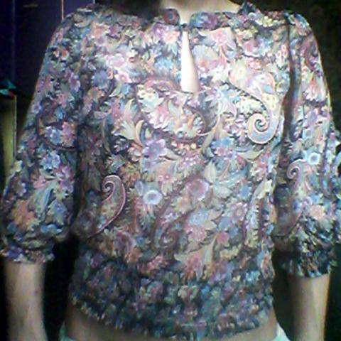 Labai gražiai marga,itin lengva,plonytė,permatomo šilko palaidinė, švelnių, pastelinių spalvų. Rankogaliai ir liemuo su gumutėmis. Rankovės trijų ketvirčių. Dydis M.