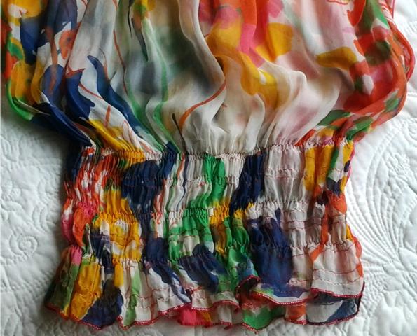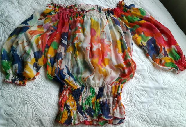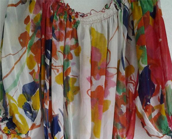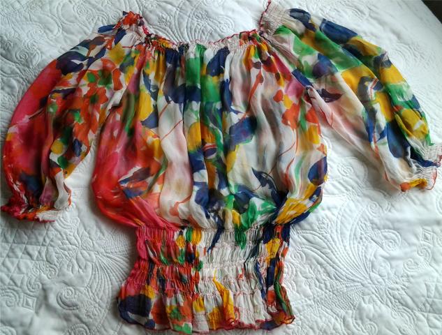 Labai ryški, lengvutė, permatomo šilko palaidinukė. Kaklas, rankogaliai ir liemuo su gumutėmis. Rankovės trijų ketvirčių. Dydis L.