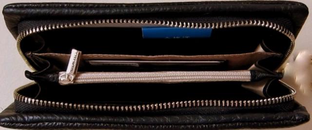 Labai patogi ir talpi. Viduje yra 5 skyriai kortelėms, 3 skyriai popieriniams pinigams + 1 skyrius su užtrauktuku (monetoms), 2 papildomi skyriai. su Nivacott dėžute Piniginės išmatavimai: 19,0x9,7x2,0 cm Trukumas: reikia pasikeisti viena uztrauktuka, nes uzsitrauke iki puses pinigines.