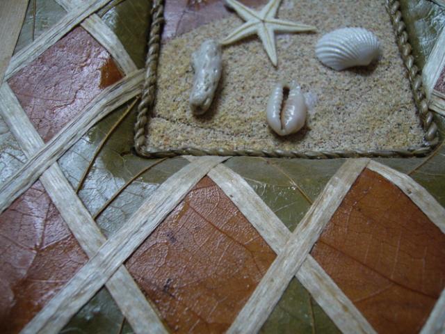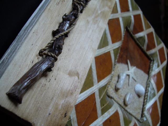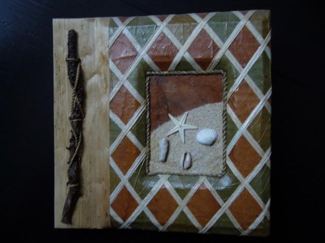 Dekoruotas dziovintais lapais, kriauklem, smeliuku, telpa 20 nuotrauku, yra kur uzkisti kampucius, puslapiai atskirti plonais lapais. Deja, nuotraukos pas mane komp. formate :)