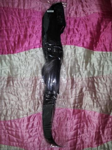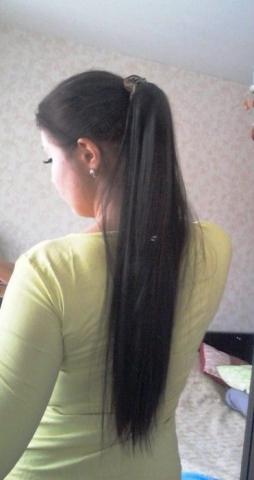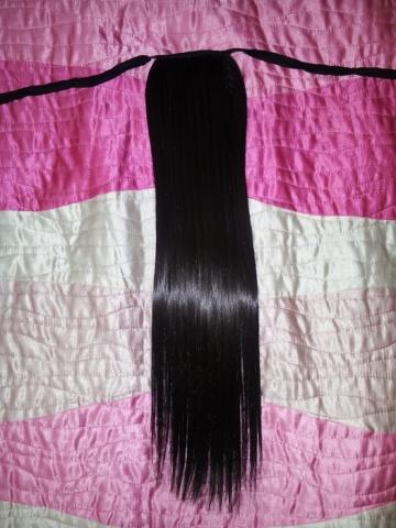 Nauja arklio uodega, ilgis apie 55cm. Turi truputį blizgesio, švelnūs. Prisiriša prie iš jūsų plaukų surištos arklio uodegos. Reali spalva tamsiai ruda.