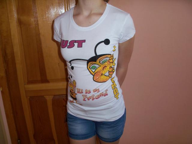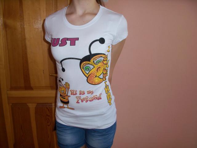 Nauja balta, žaisminga maikutė. Dydis universalus. Manau tiktų S.M.L dydžiams. Ilgis 63cm. Nuo pažasties ik pažasties 42 cm. Tempsis iki 53cm