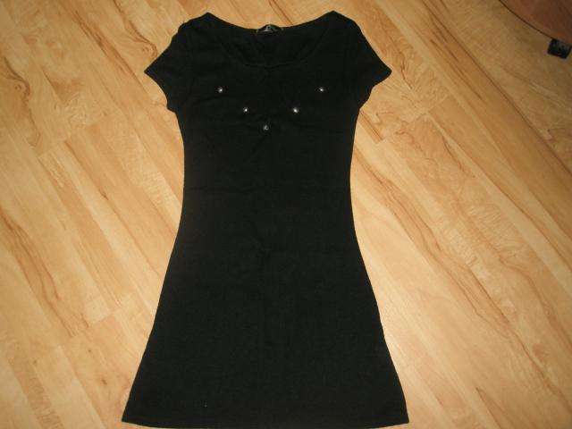 Elegantiška juodos spalvos suknelė, puošta sagutėmis.