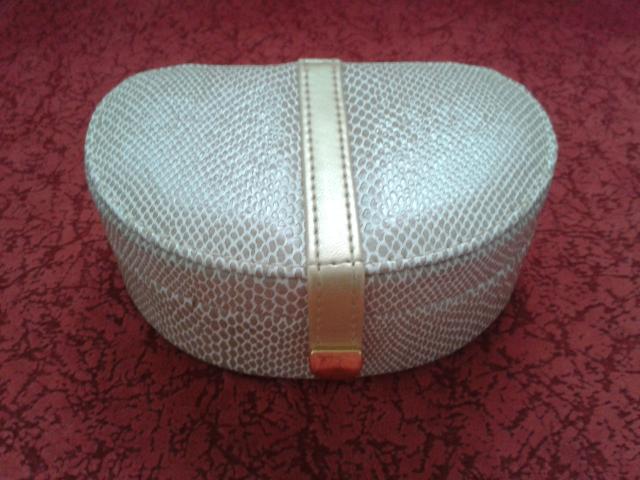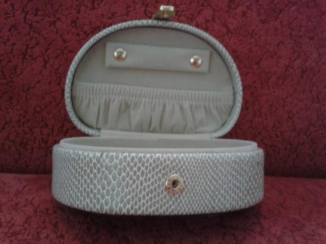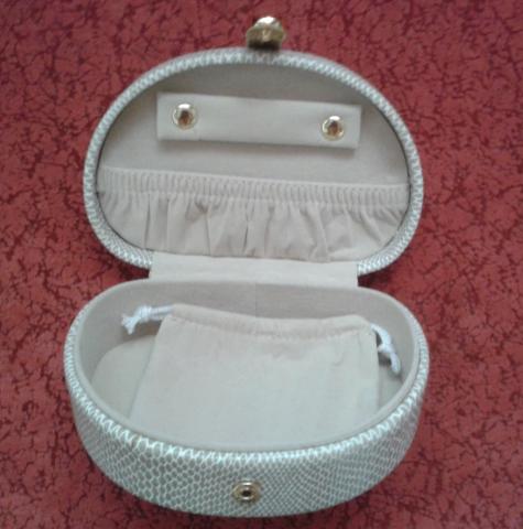Smėlinės/ kreminės spalvos, su auksiniais raštais, užsegama spaustuku. Matmenys: 14 x 9 cm, aukštis 5 cm, viduje esančio aksominio užtraukiamo maišelio matmenys: apie 7,5 x 10 cm Naujutėlė, labai graži, kokybiška, tiks ir dovanai.