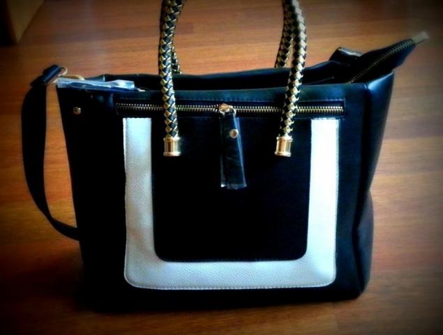 Nauja ,madinga juoda-balta rankinė, yra ilga rankena. Matmenys 24*28*13.Matmenys be rankenos. Išorėje abiejuose pusėse išorinės užtraukiamos kišenės, pati rankinė su užtrauktuku, viduje viena užtraukiama kišenė ir 2 skyreliai . Ne natūrali oda.