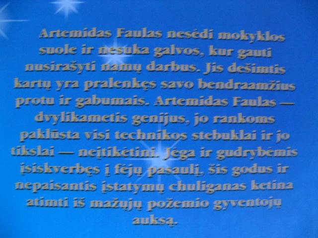 nauja knyga, Eoin Colfer - Artemidas Faulas. Artemidas Faulas nesėdi mokyklos suole ir nesuka galvos, kur gauti nusirašyti namų darbus. Jis dešimtis kartų yra pralenkęs savo bendraamžius protu ir gabumais. Artemidas Faulas - dvylikametis genijus, jo rankoms paklūsta visi technikos stebuklai ir jo tikslai - neįtikėtini. Jėga ir gudrybėmis įsiskverbęs į fėjų pasaulį, jis godus ir nepaisantis įstatymų chuliganas ketina atimti iš mažųjų požemio gyventojų auksą.