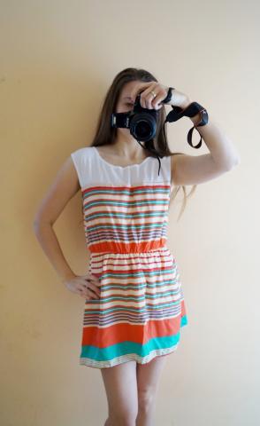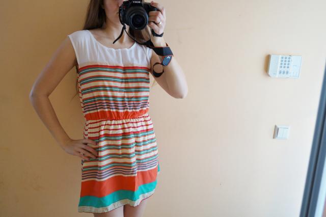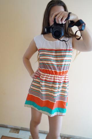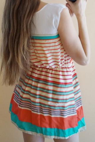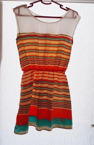 Daili suknytė, labai maloni, slidi medžiaga. Ilgis 79 cm, tarp pažastų 46 cm, ties liemeniu ramybėje 29 cm, ištempus gumą 77 cm. Klubai nueina laisvai. Tiks XS, S, mažesnei krūtinei S/M.