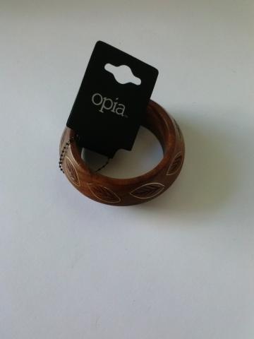 Nauja, daili opia medinė apyrankė ant rankos. Yra etiketė.