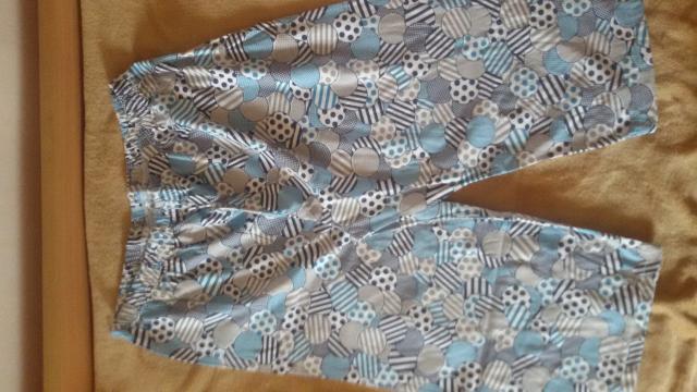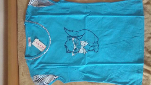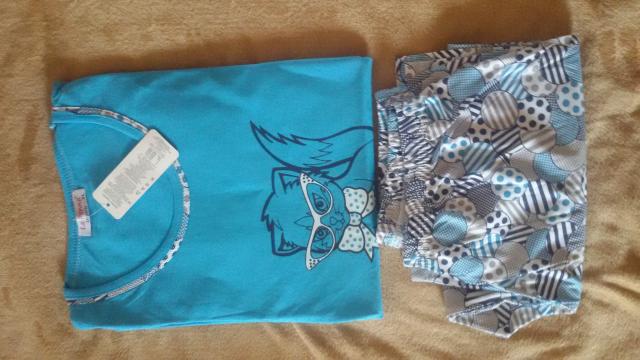 Marškinėliai mėlyni, su pavaizduotu katinu. Rankovės trumpos. Rankovių kraštai ir apykaklė – spalvoti. Kelnės 3/4 ilgio. Sudėtis: 100 proc. medvilnė. Maloni kūnui medžiaga.