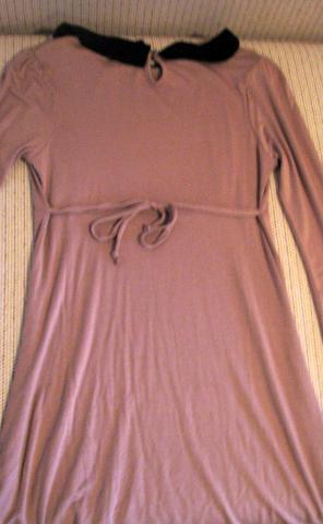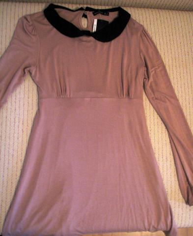Rusva suknele su raisteliais ir dailia juoda apukakle. Rankoviu galai raukti. Suknele nedeveta, dar su etikete. Sudetyje 95% viskozes ir 5% elastano
