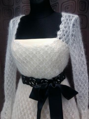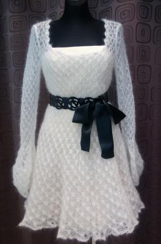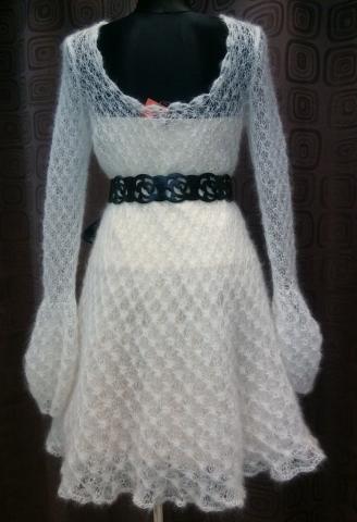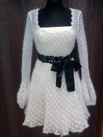 Ranku darbo suknele is dvieju daliu. Virsutinioji megzta is ypatingai geru siulu (silkmoher), apatine dalis siuta su prilaikanciu gorsetu.Audinys su elastanu ir organzos pasijoniu. Virutinioji dalis yra pieno baltumo, o apatine sampano spalvos. Puikiai tiktu tiek ir nuotakai, tiek ir ypatingai progai. Dydis tinkamas ir devincioms L.