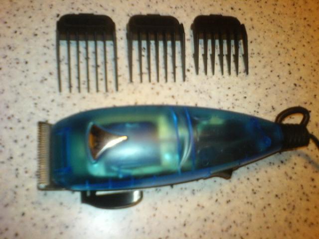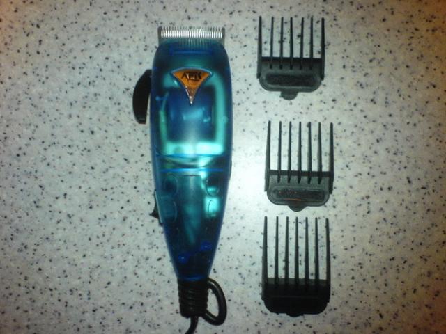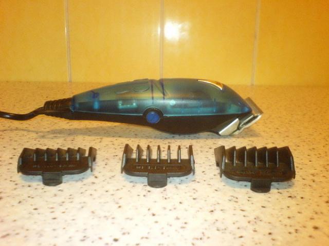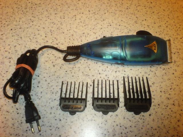 Nauja , stilinga plaukų kirpimo mašinėlė. Permatomas korpusas, nėra nei karto panaudota. Komplekte yra keturi skirtingi antgaliai. Pirkta Vokietijoje.