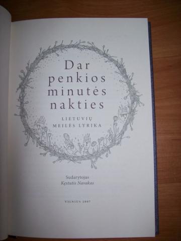 Nauja poezijos knyga. Neskaityta. Tinka dovanai. Plačiau rašoma šioje nuorodoje: http://www.knyguklubas.lt/grozine+literatura/lietuviu+literatura/dar+penkios+minutes+nakties.html