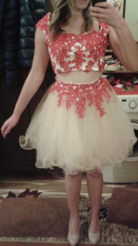 Puiki trumpa progine kreminiai-raudona suknele, su pustu sijonu, atskiru priglaustu virsumi. Visai neseniai atsiusta internetu, puikios bukles, be jokiu defektu, neglamzosi. Pukiai tinka deveti visoms progoms. Dydis S/M (ismatavimu nuotraukoje M/L), konkreciau - 10, bet tinka kaip mazesniu, taip ir didesniu krutu savininkei, liemuo- apie 70-75 cm, bet tinka ir apkunesnes liemens savininkei. Matuota tik karta, visai nenesiota. Dėl kainos galima dėrėtis. Galimas pardavimas ir Kaune.