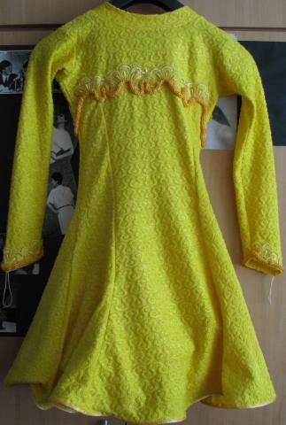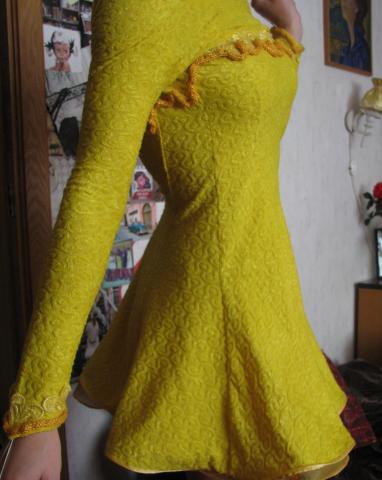 Vos vieną kartą vilkėta ryški sportinių šokių suknelė siūta pagal užsakymą. Jokių defektų nėra. Tiktų 155-160 cm smulkaus sudėjimo mergaitei, į komplektą įeina pasijonis ir kelnaitės.