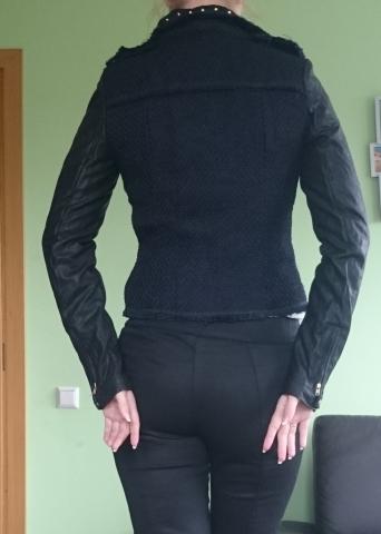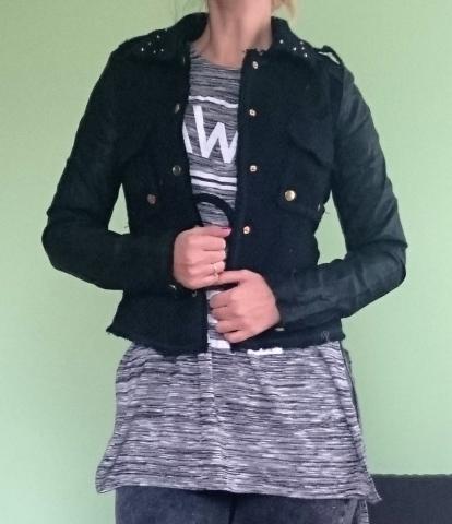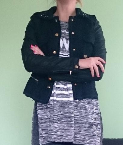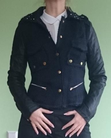 Nauja madinga striukė su odos imitacijos rankovėmis. Dekoruota auksinėmis kniedėmis. Užsisega knopkėmis. Dydis 36-S. Labai patogi. Tinka tiek pavasariui tiek rudeniui. Tamsiai mėlyna, rankovės juodos.