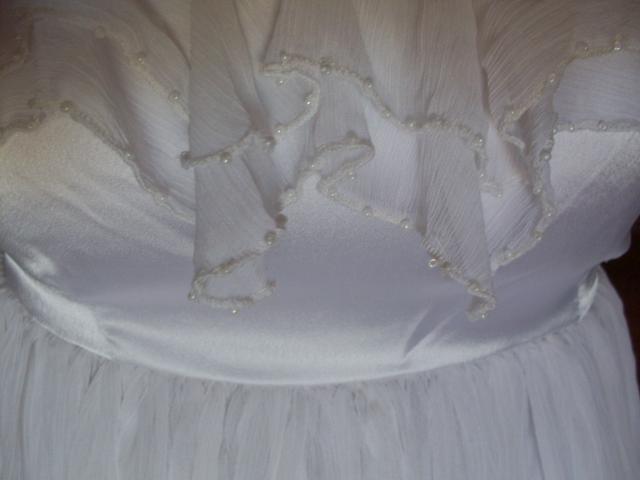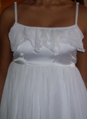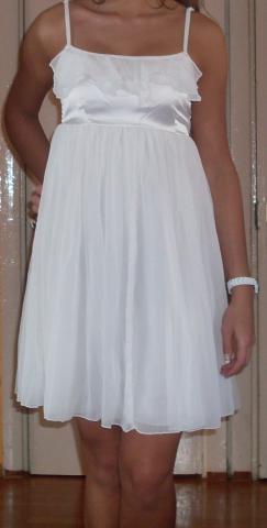 Begalo grazi,balta,lengva progine suknele.Tiktu ir XS dydziui,nes virsus tamprus-nugaroje guma.Virsuje kvarbatkeles,kuriu apacia siuvineta karoliukais.Keitimas NEdomina.