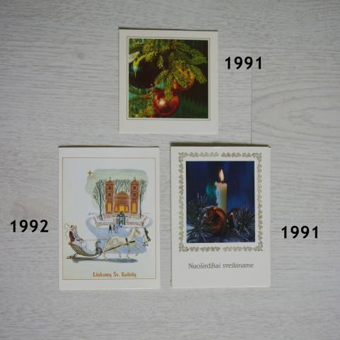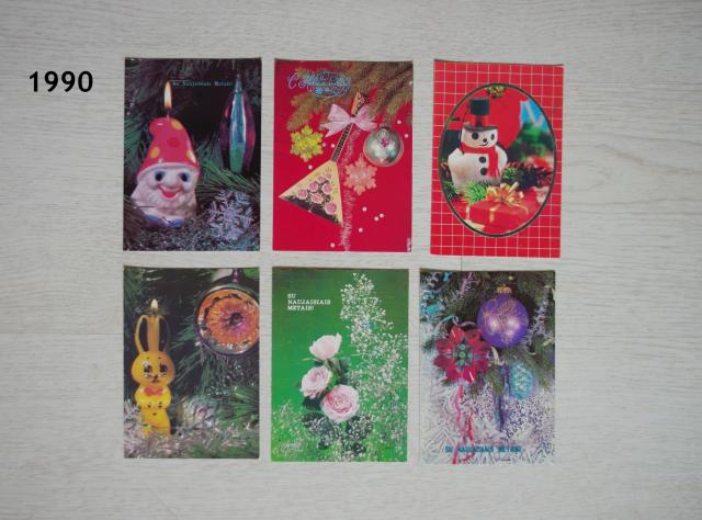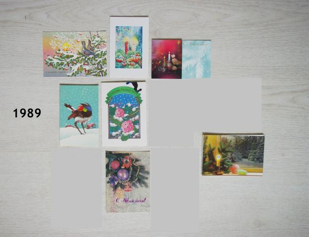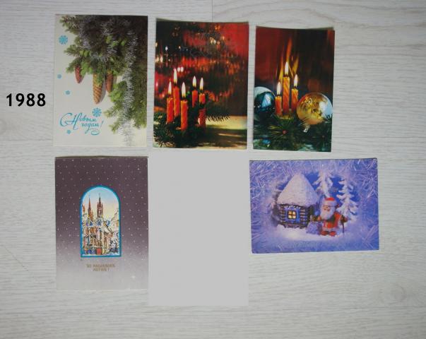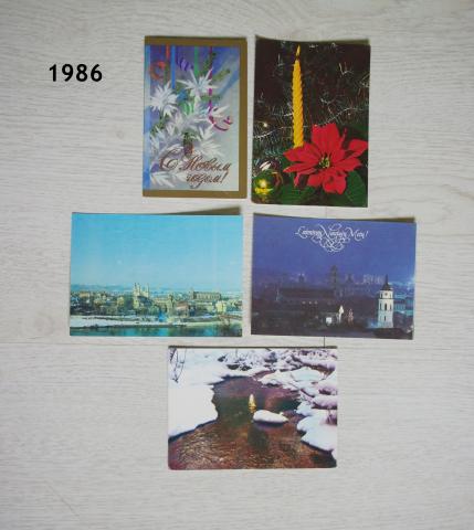 Užrašyti tarybiniai atvirukai. 1990 viršutinės kairiausios nebėra, 1986 viršutinės kairės nebėra.