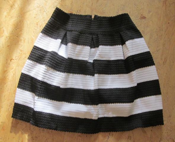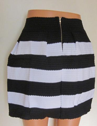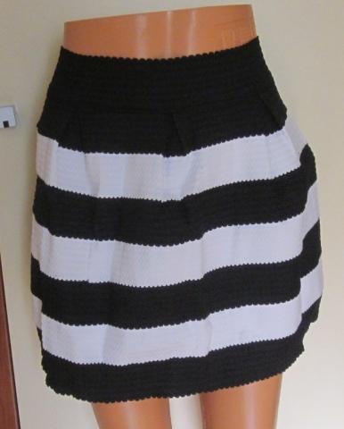 Naujas dryžuotas juoda-balta sijonas. Dydis nenurodytas, tinka XS, S, S/M ir M dydžiams. Geriausia žiūrėti pagal išmatavimus. Medžiaga labai tampri, maloni prie kūno. Ilgis 41 cm, liemuo (guma) 30x2 cm, tempiasi iki 45x2 cm, klubai 54x2 cm (sijonas pūstas, medžiaga standi).